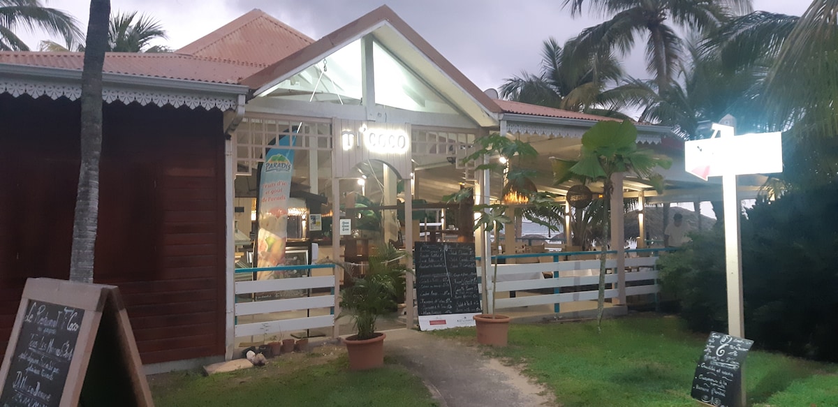 Studio d'exception pleine vue mer et plage juste en dessous. Pour 2 personnes ( + lit parapluie possible ), situé dans un parc tropical avec plage privée bordée d'un lagon, tennis, piscine à débordement, restaurant ... Cuisine équipée, linge de maison fourni, citerne tampon de 3000 litres,en cas de coupure d'eau. Photos contractuelles du logement et des environs immédiats ( 200 mètres)