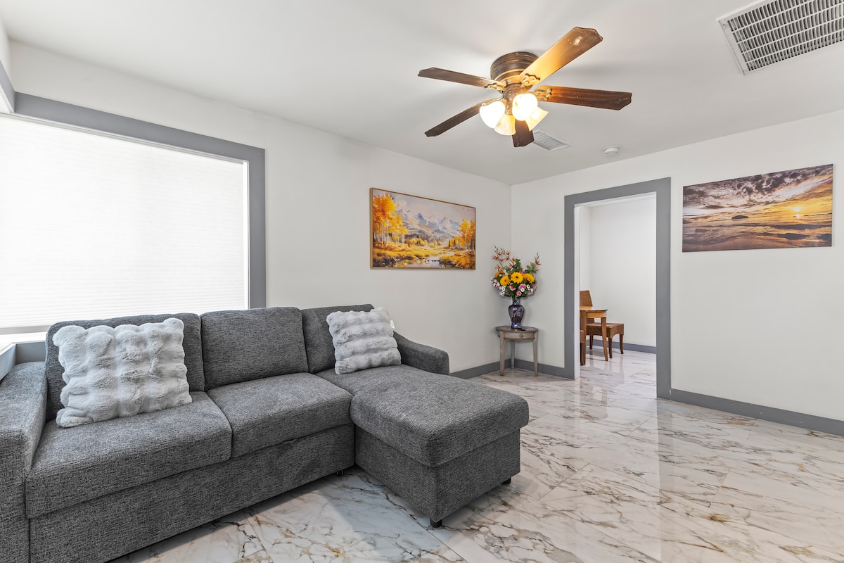 Popolnoma prenovljeno ljubko enosobno ločeno zgornje stanovanje je HLADNO, mirno, zasebno in prostorno. Ugotovite, zakaj smo znani kot »Dolina sonca«, medtem ko uživate v osupljivih sončnih zahodih na terasi! Nato se odpravite noter in si oglejte predstavo na naših OGROMNIH 70-palčnih prigrizkih, ki jih ponujamo za vas. Nahajamo se nekaj minut od spomladanskih vadbenih objektov, igrišč za golf, restavracij in trgovine z živili. Pohodništvo je prav tako tik za vogalom. Pridite in ostanite v najinem domu.
