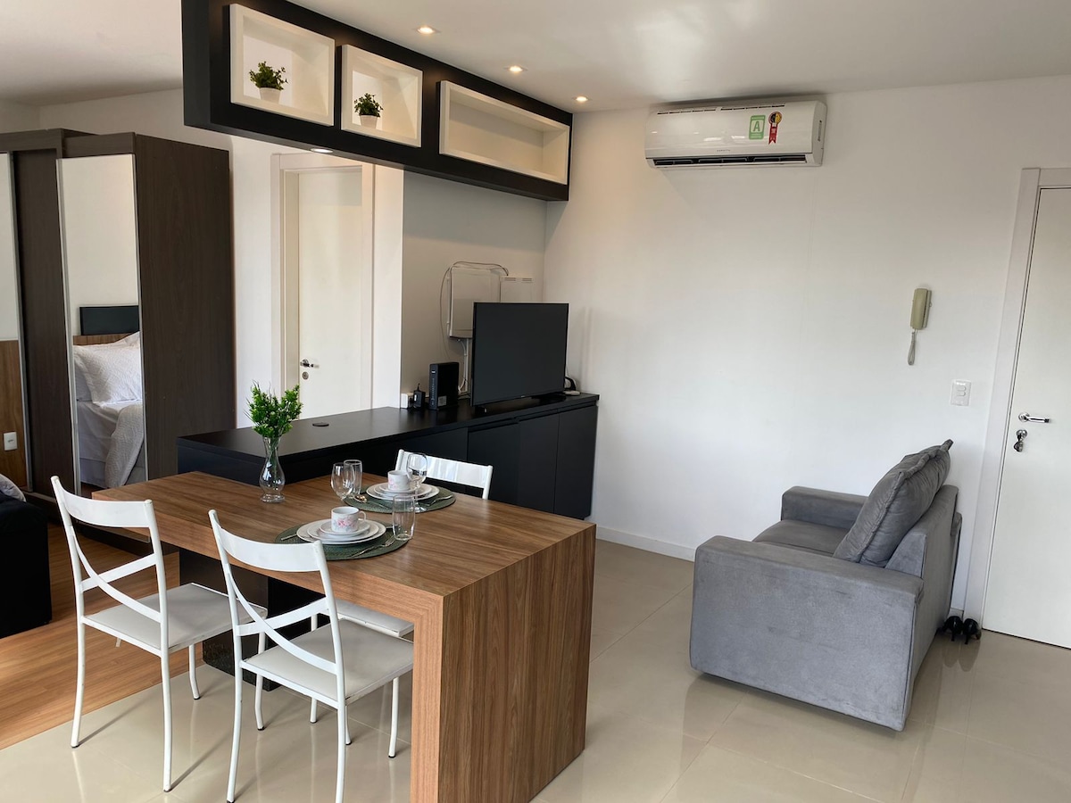 Hospede-se em um Apartamento super prático com estrutura de hotel na melhor localização da cidade, a poucos metros dos melhores restaurantes de Joinville. Ideal para estadias práticas e confortáveis. Condomínio com Piscina, Academia e Sauna. Apartamento completo de 44 m² no condomínio / hotel Prinz. Quarto com cama de casal e TV Smart. Cozinha com micro-ondas, fogão elétrico, frigobar, cafeteira e utensílios. Sala com sofá e mesa para 2 pessoas.
