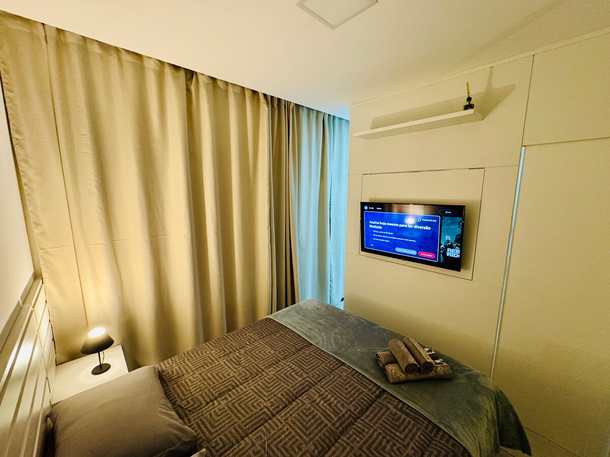 Apartamento Studio privado exclusivo para o hóspede Cama Queen + sofá retrátil 2,20 Roupa de cama/banho para 2 pessoas. Mobiliado e equipado Enxoval completo Sabonete e Shampoo. Cozinha Completa. Smart TV 40" Canais locais 02 elevadores Garagem Privativa Self Checkin - Próximo ao Bolshoi (10min. a pé) -Máquina Lava/Seca (cobrança extra) -Taxa extra p/ troca de enxoval (Cama/banho) durante a estadia. - Taxa extra acima de 2 hóspedes O uso ilícito do espaço pode ocasionar penalidades