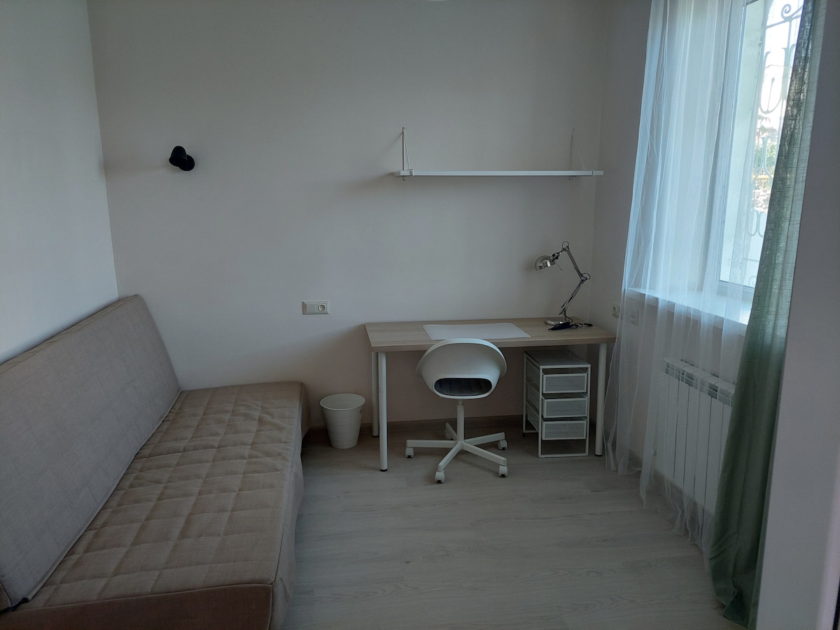 Hiška na deželi pred parkom. Skupni delovni prostor, primeren za delovne skupine IT, ustvarjalnost, sprostitev in nastanitev. V radiju 1 km so trgovine, tržnice, restavracije in kavarne. Čez cesto sta park in gozd. Lahko delate in se sprostite na vrtu. Poleti bazen, poletna kuhinja itd. Soba v hiši z ločenim vhodom in zasebnim straniščem s prho. Dober internet. Ogrevanje, topla voda. Delovno mesto. Zakonska postelja - raztegljiv kavč, stol, garderobna omara,
