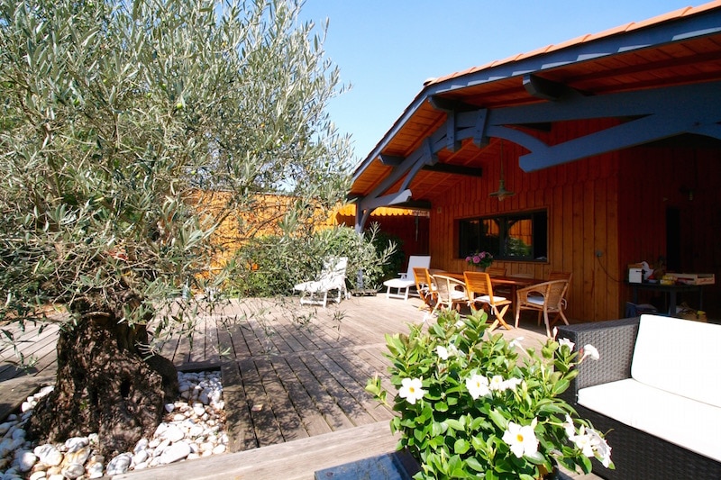 C est une maison en bois de 90m2 plein sud sur un terrain de 600m2 ... au calme sans vis à vis avec 2 belles chambres ... une chambre avec lit queen size et l autre avec un lit superposé … une salle de bain avec douche italienne et une baignoire ; elle se situe près des ports et des commerces , à 8km d Arcachon et 20 min de l'océan. Maison tout confort avec plancha , lave vaisselle et lave linge . Draps et serviettes fournis Place de parking gratuite et sécurisée Trampoline en place