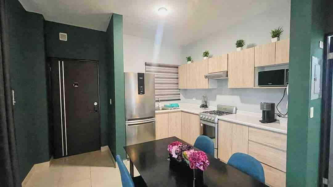 ¡Pozdravljeni, dobrodošli v vašem novem začasnem domu z najboljšo lokacijo v Monterreyju! Nahajamo se tik pred areno Monterrey in legendarnim parkom Parque Fundidora. Prihod ob 15:00 Odhod ob 11:00 Oddelek ima dve spalnici: • 1. spalnica: zakonska postelja (Queen) in zasebna kopalnica v sobi • 2. spalnica: dve ločeni postelji s kopalnico zunaj spalnice. Poleg tega stanovanje vključuje dnevno sobo, jedilnico, kuhinjo in pralnico.