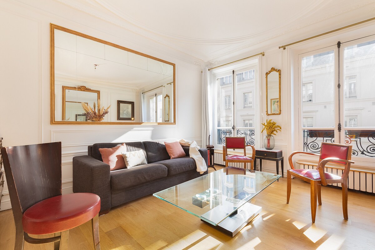 Prefinjeno stanovanje velikosti 110 m2 se ponaša s parketom, lepim pohištvom in obilno naravno svetlobo. Ponuja svetlo, elegantno, toplo in razkošno vzdušje. Stanovanje s kaminom in letvami, ki združuje čar, mir in udobje, se nahaja v enem najstarejših prehodov v zgodovinskem središču Pariza. To stanovanje ima uradno dovoljenje za turistično nastanitev. Zato je popolnoma zakonito.