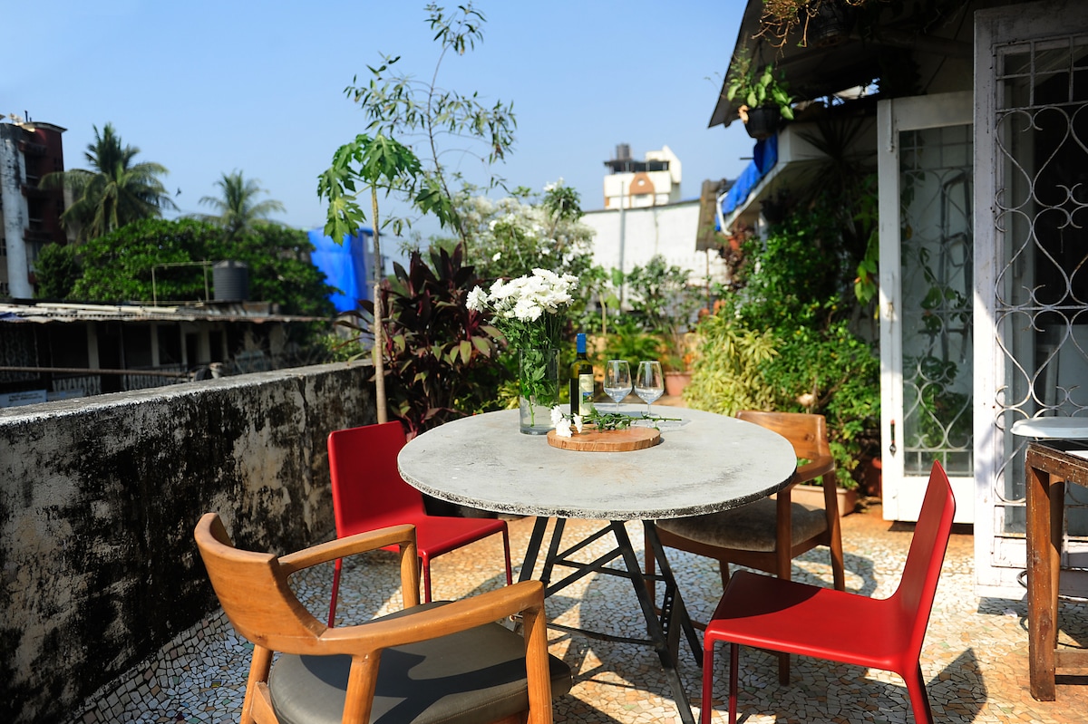 The terrace apartment is located in an urban market -a short walk from the famous Juhu beach .The apartment is open and spacious with a long terrace full of plants .. it's a quiet oasis in the middle of a hustling city .The house can comfortably accommodate two in a private bedroom and an additional person in the living studio space (if the hammock counts). You'll wake up to a view of green trees and open skies .. The home although in an old building has all the modern amenities one needs.