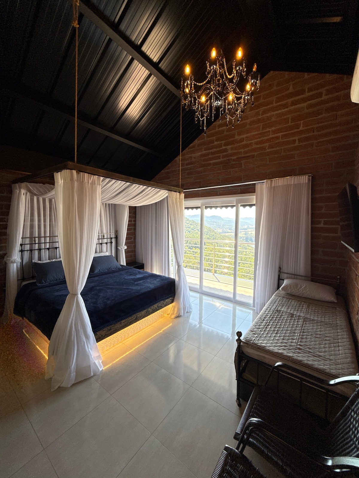 Somos um sítio com 17 hectares, um refúgio seguro, com portão fechado e uma terra com vida. Há ovelhas no pasto, galinhas que ciscam livres, e uma horta sazonal que será deixada na sua porta. São 120m² com quase 10 metros de pé-direito. Todas as comodidades são de uso individual. Servir a si mesmo não é tarefa: é escolha, é cuidado. Reencontro — com quem você é quando o mundo lá fora silencia. Esperamos que viva aqui momentos raros — celebrações íntimas, para até 4 pessoas.