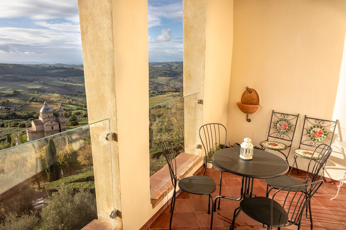 Huge and charming top floor apt in Tuscan Villa with breathtaking view! Visit Montepulciano, Pienza, Siena, explore country side, vineyards and hot springs, hiking or e-biking, strolling or driving! Two roomy suites with top quality beds and bathroom ensuite. Windows walled living room, comfy sofas, professional kitchen at your own use. We can set Winery visit & tasting, Cooking classes and private dinners. NEW Hot tub facing green hilltop! ExperienceTuscany as a local, with your local Host!