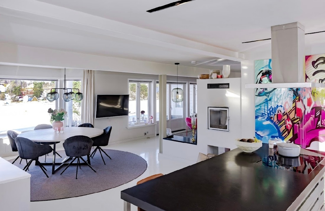 Only 50 minutes from Oslo, this spacious house is located in a wonderful, quiet, sunny, seaside location. Most rooms offer panoramic views of the fjord. The house has a modern dark interior, a fully equipped open kitchen and a spacious living room that connects with sliding glass doors to a large veranda, facing west and overlooking the sea. Parking in the front yard. Charger for electric car is available for a fee.