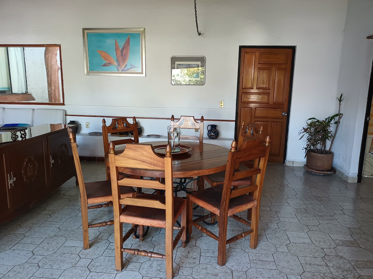 Amplia casa con alberca y jardín privado. Ocupación máxima de 10 huéspedes pero el precio se determina segun el número de personas que se hospedan. La alberca cuenta con celdas solares. Dentro del club de golf para los que gustan de éste deporte. Ideal para familias que viajen con niños y deseen pasar un fin de semana relajandose. Cuenta con restaurantes cercanos y autoservicios. Cerca de salones de eventos, zoologicos, parque acuatico, pueblos mágicos y la laguna de Tequesquitengo