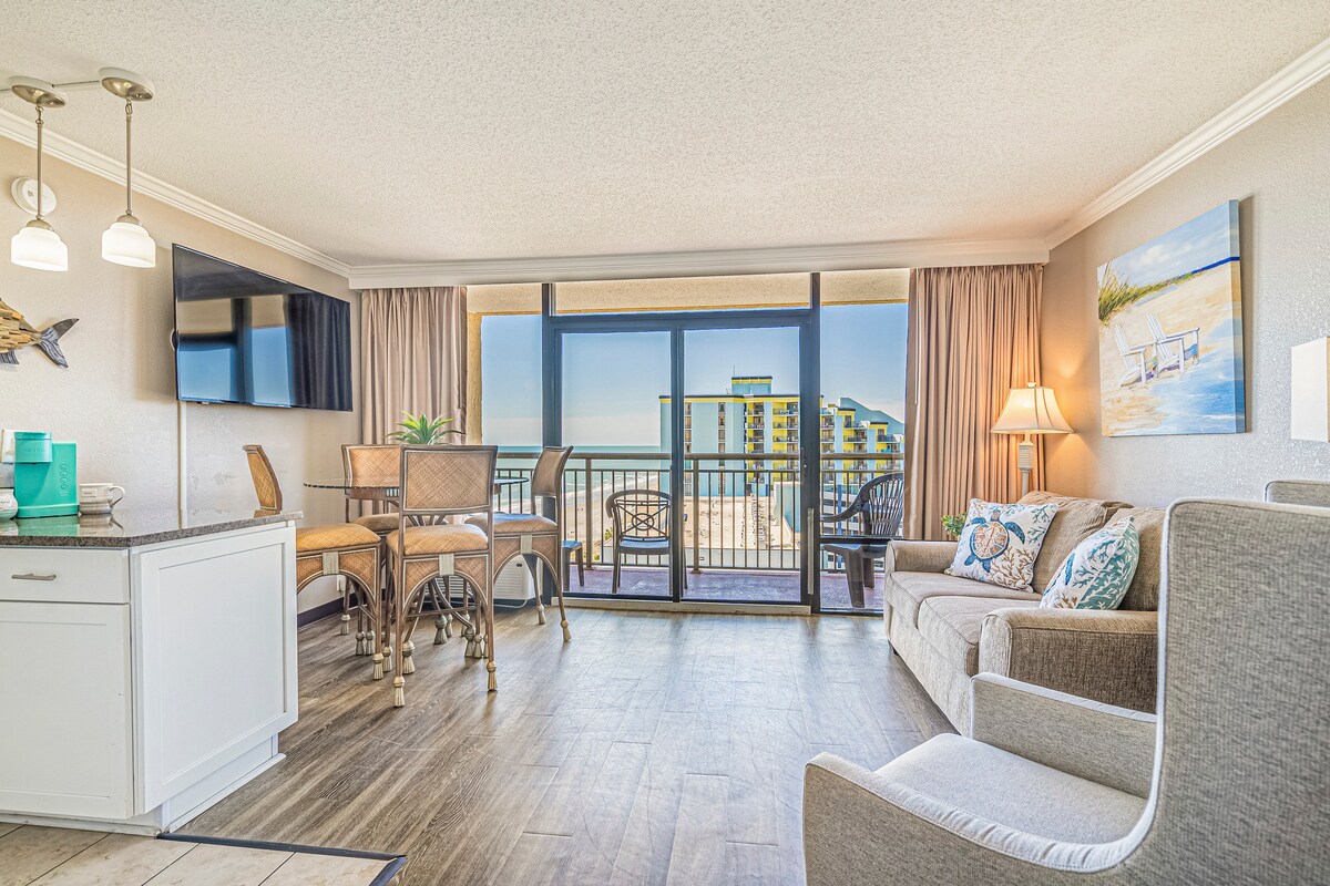 Očaralo vas bo to čudovito prenočišče z očarljivim razgledom na ocean od koderkoli v sobi. Ta prenovljena enota je učinkovita hotelska soba s kaminom za ogrevanje/brez ogrevanja, 50-palčnim televizorjem s kabelsko televizijo in pretakanjem, zakonsko posteljo, raztegljivim kavčem in kopalnico. Kuhinja ima kuhalno ploščo z dvema gorilnikoma, veliko mikrovalovno pečico, cvrtnik, hladilnik in aparat za kavo Keurig s skodelicami, smetano in sladkorji.