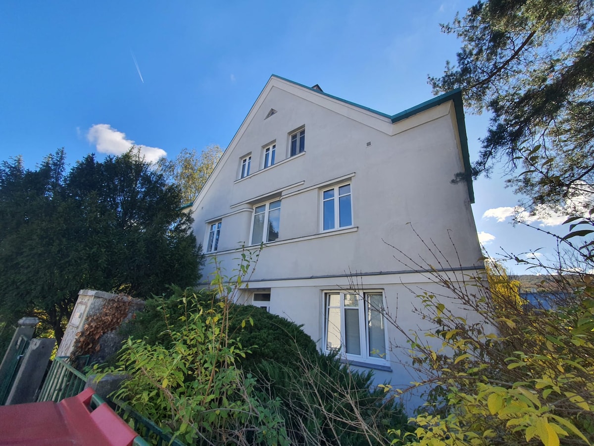 Stanovanje s 3 sobami ena za drugo v ločenem delu vile na zahodnem obrobju Dunaja. Dobre povezave z javnim prevozom (vlak in avtobus) do centra, 1 zasebno parkirno mesto pred hišo. Udoben zimski vrt, očarljiva soba z veliko zakonsko posteljo, enojno posteljo in sedežno garnituro. Spalnica (dve vrati) z zakonsko posteljo in pogradom. Priročna kuhinja s kavčem, jedilnico, pomivalnim strojem, mikrovalovno pečico, ki vključuje pečico. Kopalnica vključuje stranišče in prho.