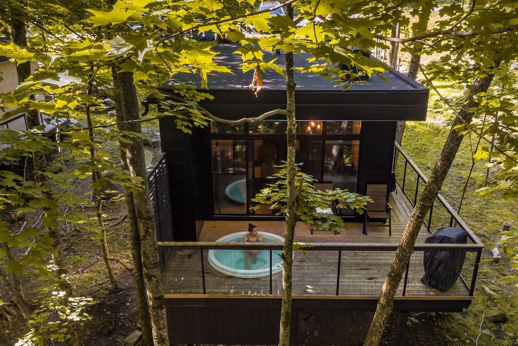 Cosy timeless chalet conceptualized by the architects of _naturehumaine. Nestled into the cliffside at an altitude of 490 meters (1600 feet), its unique design is distinguished by boldness and originality and fits with harmony in its environment. Surrounded by forest, the cottage offers breathtaking views of Mount Glen and the surrounding nature largely protected by the Appalachian Corridor. The perfect silent place to relax and unwind. Photo: Adrien Williams / S.A. CITQ #302449