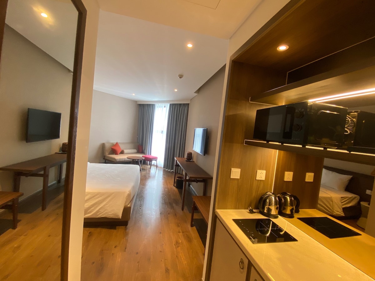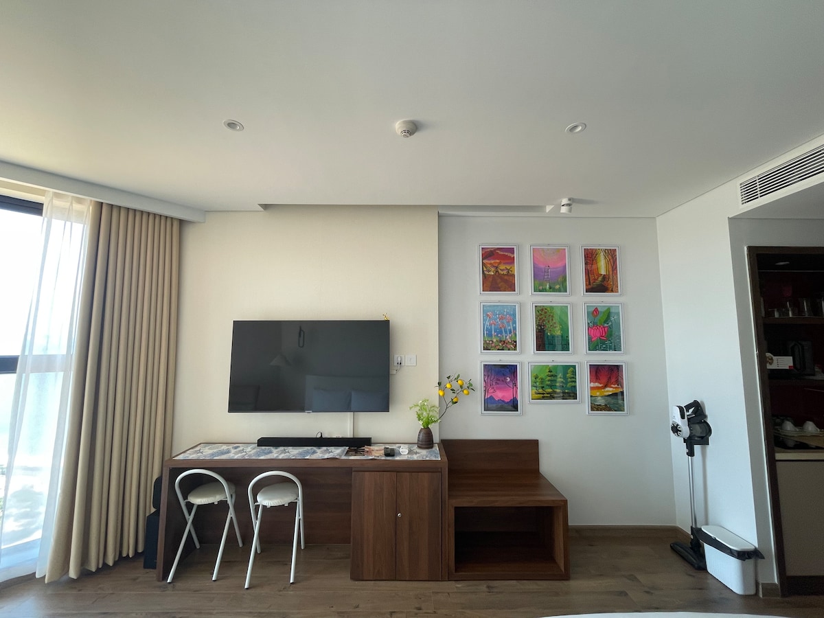 Studio sang trọng tại Apec Mandala Mũi Né – khu phức hợp 5⭐ cạnh biển, đầy đủ tiện nghi: bếp, TV, wifi. Hai giường đơn ghép thành giường lớn. Khách được dùng hồ bơi vô cực, gym, spa, nhà hàng, bãi biển riêng. Cuối tuần có drone show cực đẹp. Phù hợp cặp đôi, gia đình nhỏ, du lịch nghỉ dưỡng