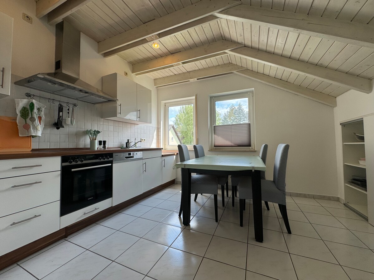Panoramsko 60 m² veliko stanovanje – za največ 4 goste • zakonska postelja, raztegljiv kavč, zložljiva postelja (na zahtevo), otroška posteljica • Popolnoma opremljena kuhinja: štedilnik, pečica, grelnik vode, aparat za kavo, pomivalni stroj, hladilnik, TV • visokokakovostna posteljnina, brisače, kava in čaj • velika terasa z ležalnikom in pogledom na naravo Odlična lokacija: • 5 min z avtomobilom / 30 min hoje do središča Idsteina • Pohodniške poti se začnejo pri vratih • 20 minut do letališča Frankfurt in Wiesbadena • 2 km do avtoceste • bližnje igrišče in vrhunska restavracija z žarom