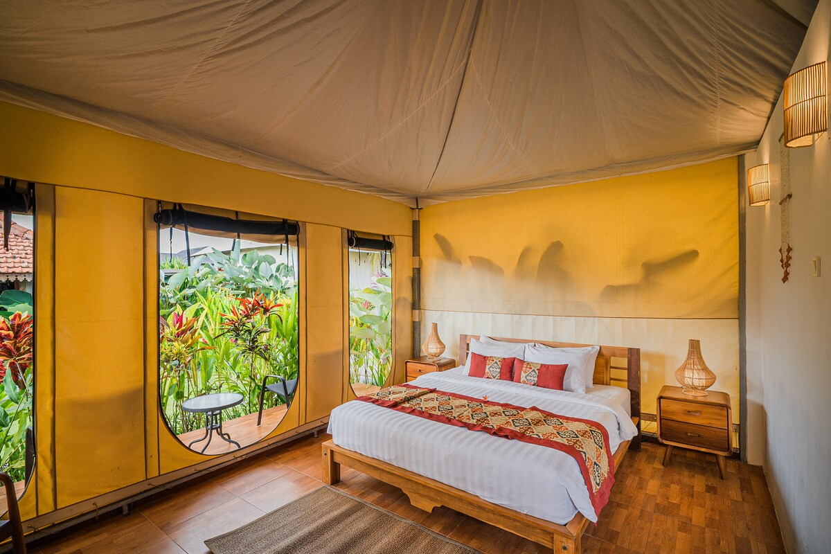 Paddy’s Glamping in Munggu, Bali, offers a serene and romantic glamping experience just a short walk from Munggu Beach. The Deluxe Room is designed for comfort amidst nature, featuring a king-size bed, air conditioning, private bathroom, and both indoor and outdoor seating areas