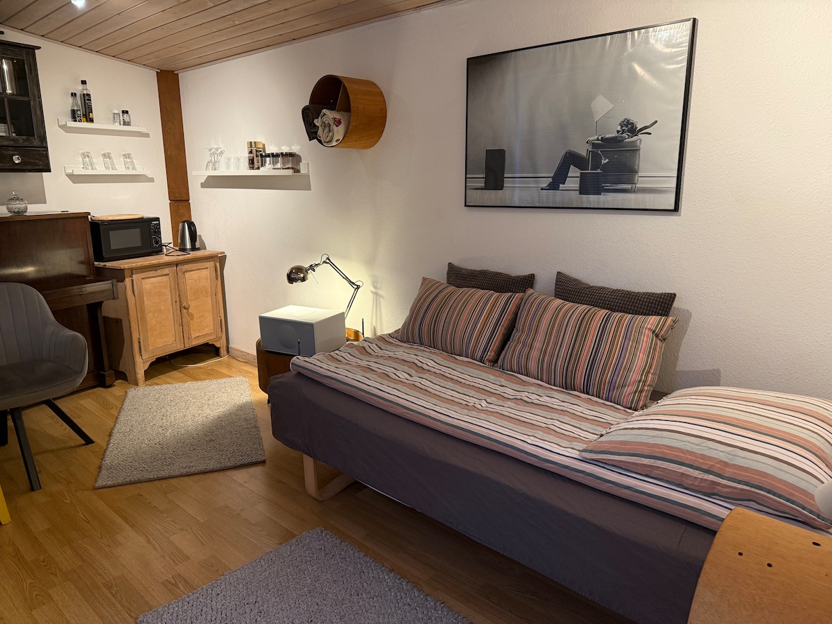 Du får din egen indgang til lejligheden. Fra soveværelset indgang til TV stue / tekøkken med mulighed for opredning til 2 personer på sovesofa. Fra TV stuen er der indgang til eget bad / toilet. Der vil være mulighed for at opbevare ting i køleskab med lille fryser. Der er el kedel så man kan lave kaffe og te. I tekøkkenet findes 1 mobil kogeplade og 2 små gryder samt 1 ovn Der må ikke steges i rummet. Kolde drikkevarer kan købes for 5 kr. og vin 35 kr. Betales kontant eller MobilePay.