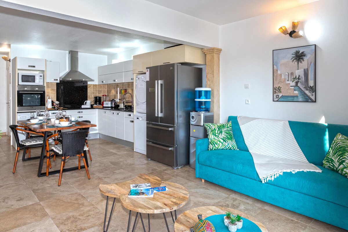 Stunning views of the Caribbean Sea, directly on the beach, overlooking a palm garden and the pool. Carefully decorated and fully equipped villa, air-conditioned, with a water reserve for your comfort. Located in a private, quiet, and secure residence with 4 swimming pools, 2 tennis courts, and private parking. Close to shops, restaurants, bakery, pharmacy, rotisserie, and car rental. Enjoy your meals on a large terrace with an electric awning.