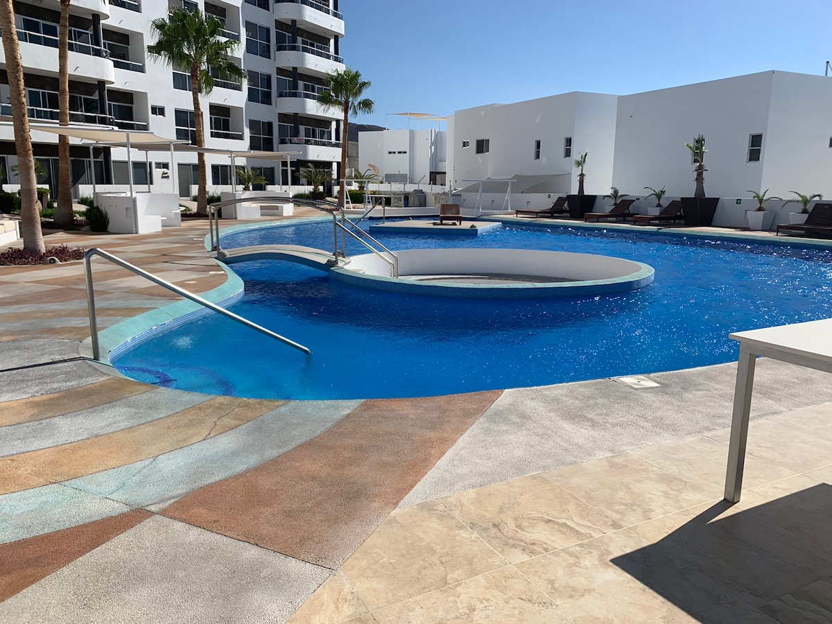Vsako jutro se zbudite ob osupljivem razgledu na turkizno morje Baja Sur v tem ekskluzivnem in udobnem stanovanju. Popolnoma se nahaja v bližini najboljših plaž, restavracij, barov in supermarketov. Uživajte v razkošni opremi, kot so dva bazena, telovadnica, zasebno parkirišče in dvojni varnostni obroč non stop. Ne glede na to, ali se želite sprostiti, uživati v romantičnem oddihu ali raziskati pustolovščine na kopnem in morju, je to vaš popoln kraj. Pogled bo ostal z vami za vedno!!