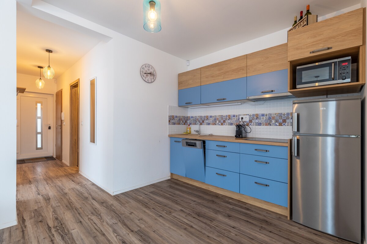 Stanovanje v na novo zgrajeni 4-stanovanjski stavbi, notranje dvonadstropno stanovanje v prvem nadstropju za 4 osebe. Opis stanovanja: hodnik, soba za 2 osebi z zakonsko posteljo, dnevna soba z ameriško kuhinjo, jedilnica, kopalnica s prho in straniščem, terasa, zgornji hodnik s kavčem, soba za 2 osebi z zakonsko posteljo in majhnim balkonom, kopalnica s kadjo in straniščem, velika terasa. Vse sobe in dnevne sobe so klimatizirane. Parkiranje je zagotovljeno na zaprtem dvorišču.