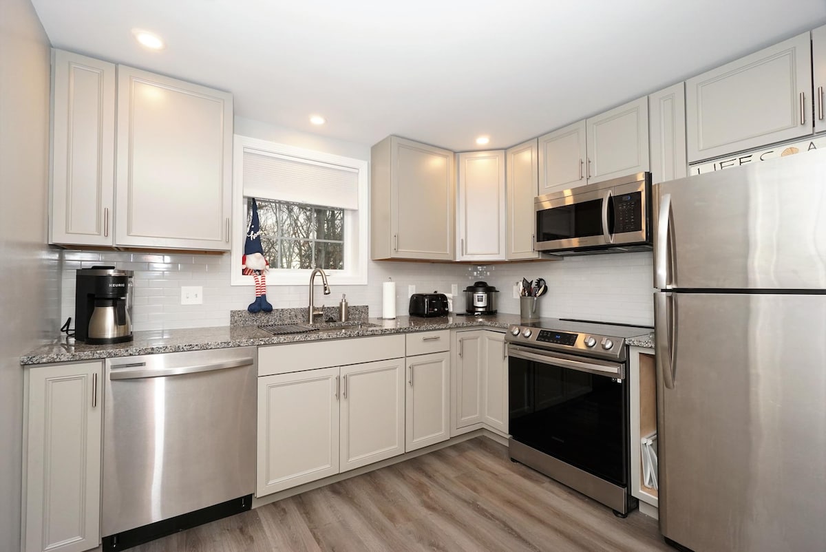 To novo, zelo zasebno stanovanje, ki je povezano z našim domom, je v mirnem in slikovitem okolju, le nekaj minut stran od Dock Squarea. Odlično je za pare, samostojne pustolovce in družine z enim otrokom. Če želite preživeti dan na eni od čudovitih plaž Kennebunk, so le nekaj minut stran. Zavezani smo k okoljski trajnosti, stanovanje pa poganja sončna energija. Februarja 2024 je bila pred kratkim nameščena nova zunanja masažna kad. Veselimo se vašega obiska.