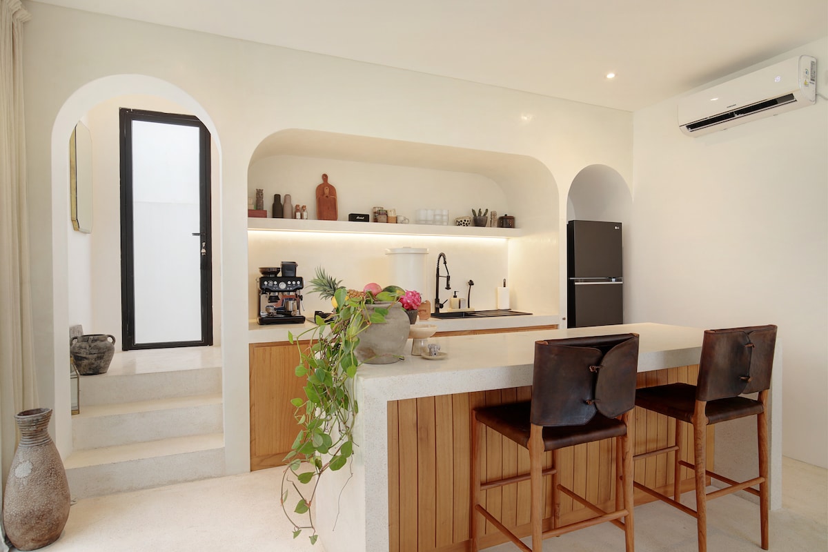 Ta sodobna dvonadstropna vila z eno spalnico je elegantno zatočišče v osrčju Cangguja. Zasnovano je s čistimi linijami, toplimi naravnimi odtenki in obilico svetlobe ter ponuja udobje in zasebnost na odlični lokaciji. Spalnica v zgornjem nadstropju je miren in sproščujoč prostor za oddih, v pritličju pa je zaprt bivalni prostor s popolnoma opremljeno kuhinjo. Zunaj je vaš zasebni bazen, obdan s tropskim zelenjem. Le nekaj minut stran od kavarn, restavracij in plaž, a vseeno skrito, da boste lahko uživali v mirnem bivanju.