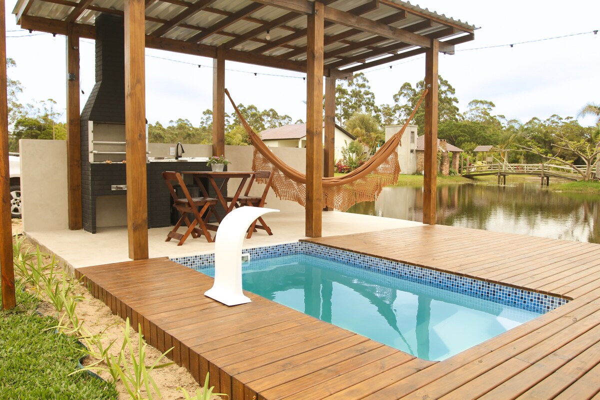 Faça uma pausa para relaxar nesta casa de campo com piscina com vista para a lagoa e localizada a apenas alguns quilômetros da praia de Balneário Gaivota. A casa tem acesso a lagoa, que é própria para práticas esportivas como canoagem, pesca, jetski ou apenas relaxar em contato com a água. A casa conta com dois banheiros, um interno e um externo.