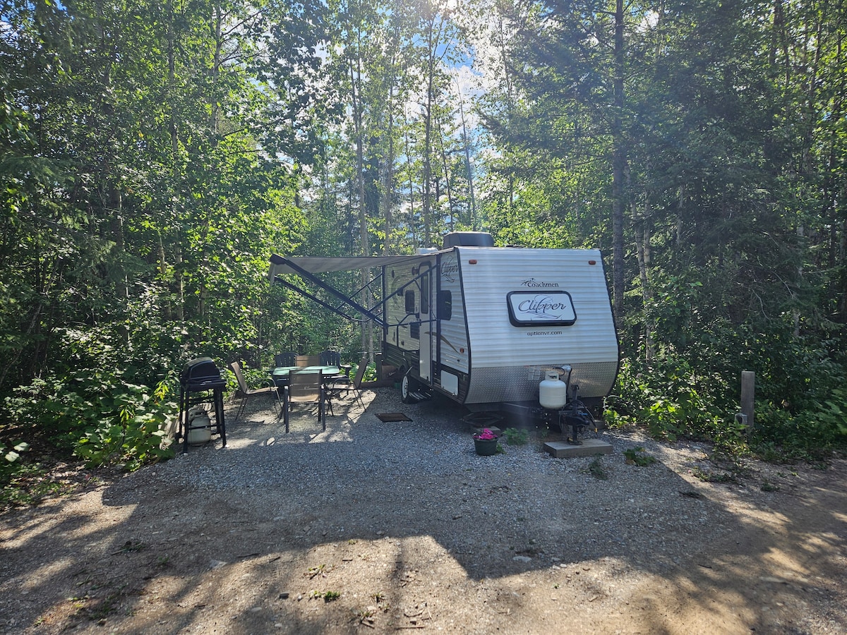 This is our travel trailer setup in one of the best campsites we have. We call it glamping.. perfect for those wanting to camp but not "rough it". You will need firewood for the firepit.