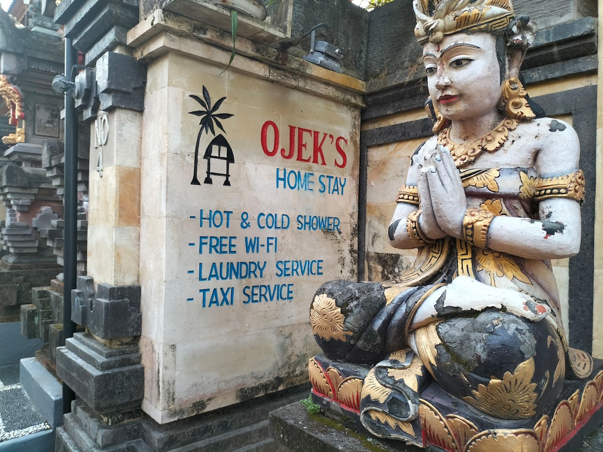 Naše prostorne in udobne sobe imajo zakonsko posteljo in nudijo toplo in hladno prho, dostop do omrežja Wi-Fi,ventilator in klimatsko napravo . Zajtrk je vključen. Nahajamo se le 700 m stran od opičjega gozda in 10 minut hoje od središča Ubuda. Nudim tudi taksi službo za prevzem,dostavo,enodnevne izlete po Ubudu: Riževa terasa Sveti vodni tempelj Nasadi kave Slap Slon jamski tempelj Sončni vzhod treking Rafting na vodi Tečaj kuhanja na kolesarjenju Itd. Prosimo, da me prosite za več informacij:)