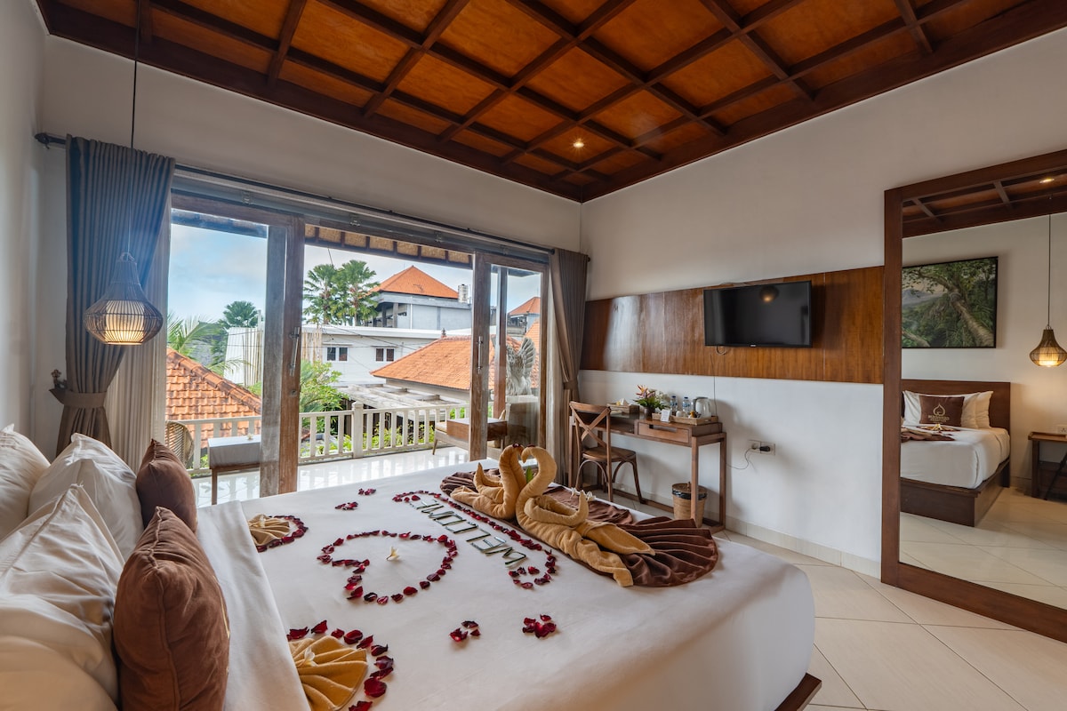 Naše prostorne in udobne sobe imajo zakonsko posteljo (Queen) ter nudijo vročo in mrzlo prho, dostop do Wi-Fi in stropni ventilator. Zajtrk je vključen. Nahajamo se le 700 m stran od Opičjega gozda in 10 minut hoje stran od središča Ubuda. Nudim tudi taksi službo za prevzem,dostavo,enodnevne izlete po Ubudu: Riževa terasa Sveti vodni tempelj Nasadi kave Slap Slon jamski tempelj Sončni vzhod treking Rafting na vodi Tečaj kuhanja na kolesarjenju Itd. Prosimo, da me prosite za več informacij:)