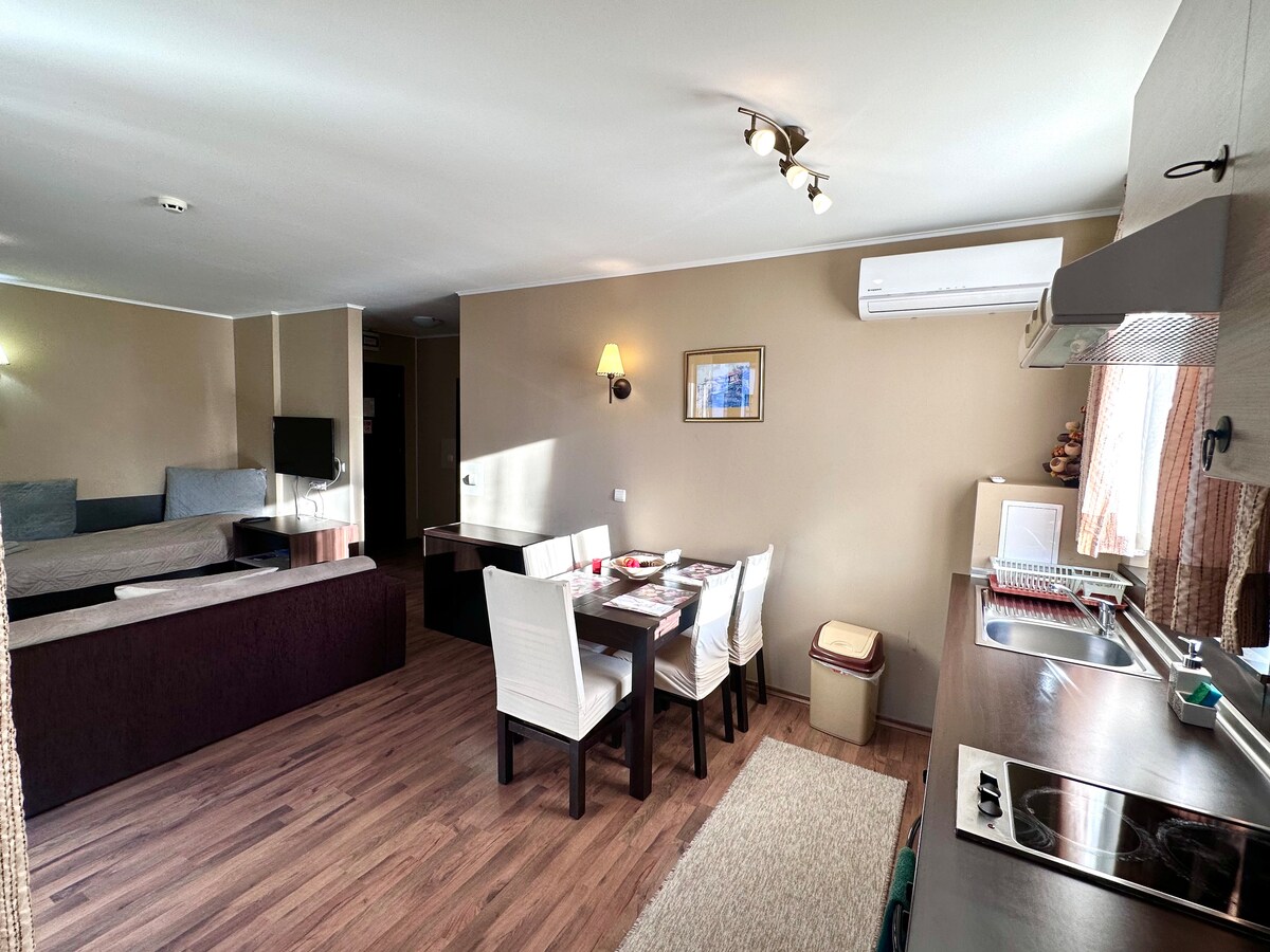 Apartma s pogledom na gore se nahaja v kompleksu in ponuja popolno ravnovesje med smučanjem, golfom, sprostitvijo v spa centru in naravo. Apartma je odlična izbira za zimsko in poletno bivanje, saj je oddaljen le 6 km od smučišča Bansko, 5 minut od vrhunskih igrišč za golf in obdan z narodnim parkom Pirin. Gostje uživajo v čistem gorskem zraku, gozdnih poteh in hitrem dostopu do smučišč, igrišč za golf, termalnih vrelcev in slikovitih gorskih poti.