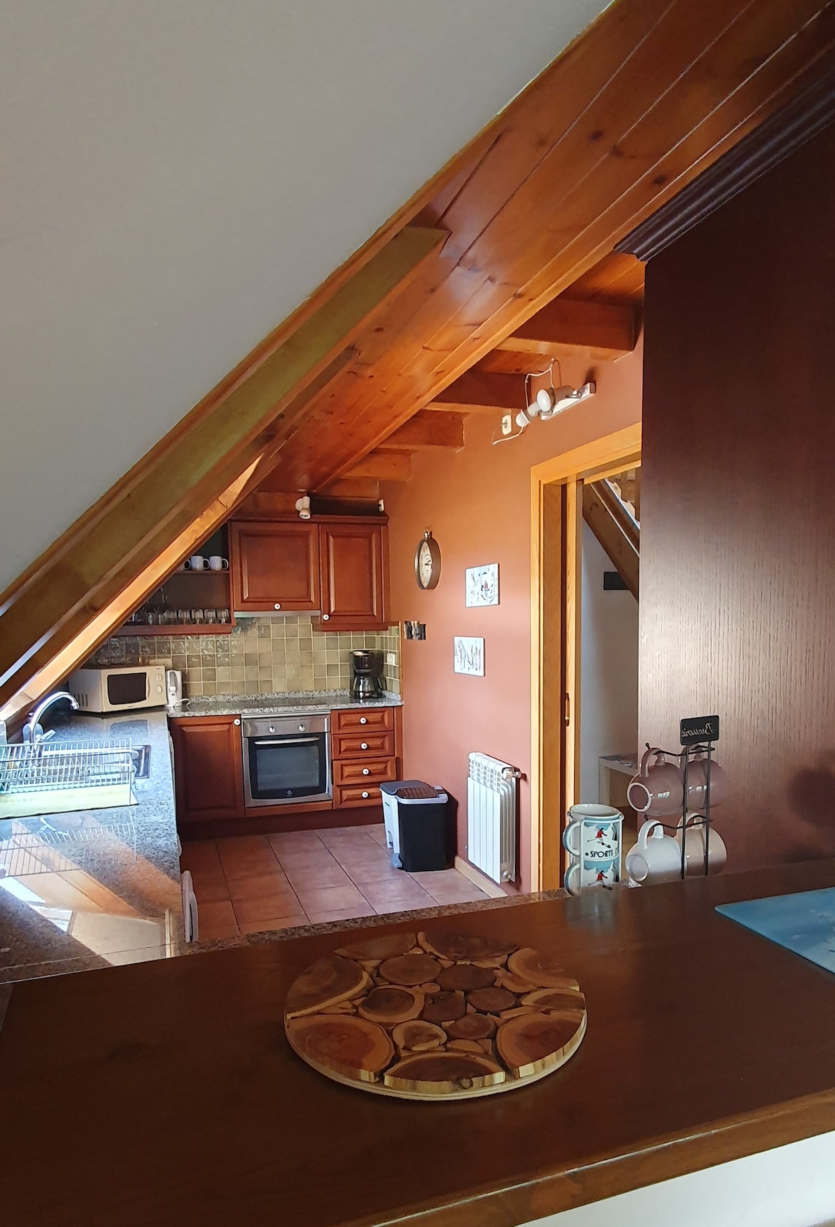 Ven a disfrutar y a relajarte en mi acogedor ático dúplex con vistas a Vielha y a sus espectaculares montañas. Se ubica a 8 minutos de Vielha caminando y 2 minutos en coche, el ático no dispone de parking, aunque en los alrededores es fácil aparcar gratuito. El apartamento es muy luminoso, dispone de dos habitaciones con baño completo cada una, cocina equipada, comedor con sofá-cama y chimenea de leña.Es una zona muy tranquila, ya que la casa solo se compone de dos pisos.Dispone de Wifi.