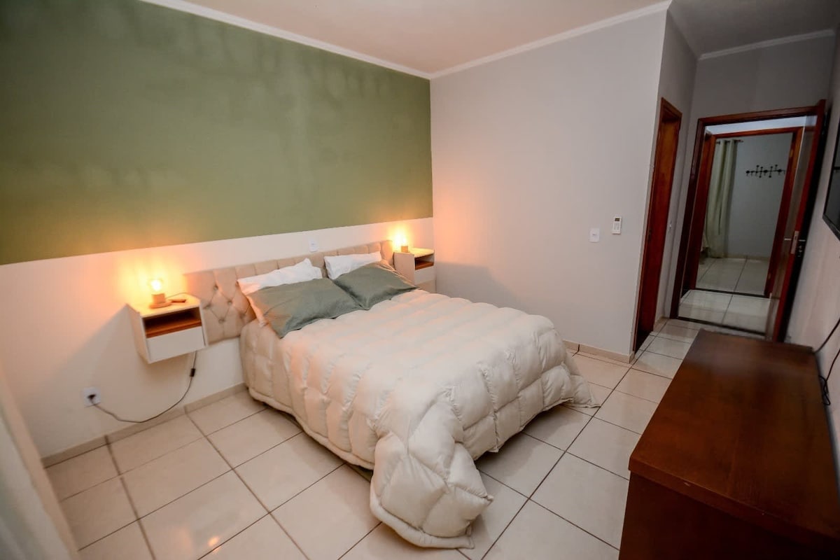 Casa com piscina, churrasqueira, sauna e ar condicionado nos quartos. Garagem murada para até 6 carros e gramado disponível para brincar/jogar. Disponível para finais de semana ou estádia mais longas. 4 quartos com cama de casal, sendo um suíte. Colchão de solteiro disponível. Escritório para a trabalhar e wi-fi incluso.