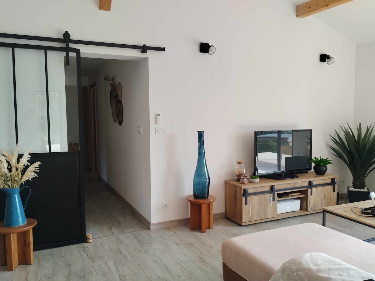 dupleks stanovanje velikosti 110 m2 v rezanem kamnu ,sestavljeno iz dveh velikih spalnic , dnevne sobe ( 30 m2 ), dnevne sobe, ki se lahko uporablja kot tretje spalnice ( raztegljiv kavč), dveh kopalnic s prhami, dve stranišči , jacuzzi, ki se odpira na teraso . Klimatska naprava v spalnicah in dnevni sobi. Internet ( vlakna ), Wi-Fi , povezana televizija,Netflix Stanovanje se nahaja na priročni lokaciji v središču vasi.