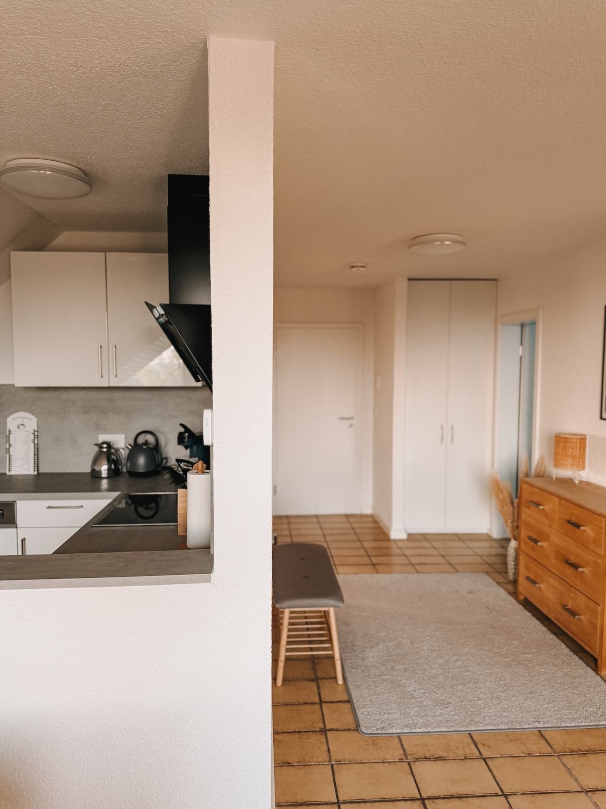 Stanovanje je sestavljeno iz dnevne sobe, spalnice, kopalnice. V spalnici je zakonska postelja, v dnevni sobi je raztegljiv kavč (1,20 m ležeče širine). Je visokokakovostno opremljen in zasnovan z udobnimi tlemi iz plute. Poleti je možna uporaba vrta, na voljo pa so tudi parkirišča in shramba za kolesa. Živimo v vasi, do A2 pa lahko pridete z avtomobilom v 15 minutah.