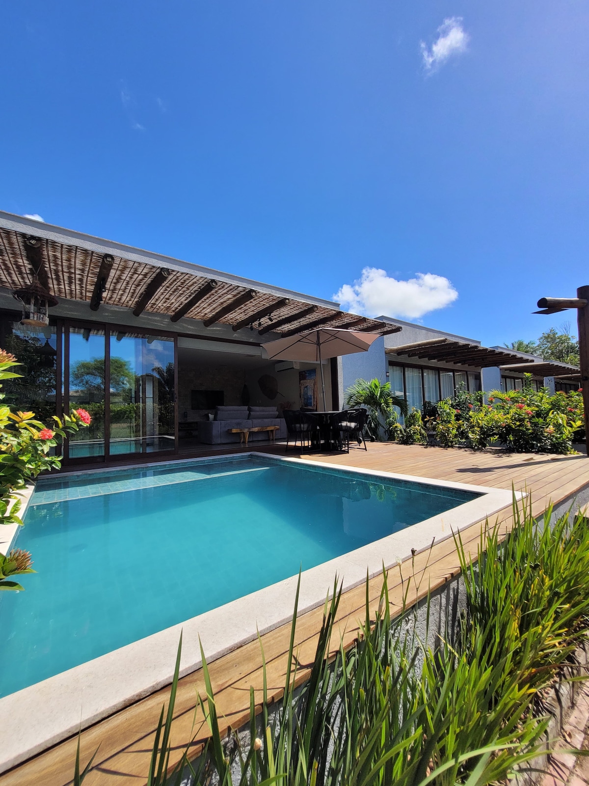 Spoznajte hišo Tsuru!! Navdihnjen z umetnostjo origamija se nahaja 40 metrov od plaže, 50 metrov od točke za deskanje in 300 metrov od naravnega bazena Taipu de Fora. S 3 kopalnicami, kuhinjo in klimatizirano dnevno sobo, gurmanskim kotičkom in zasebnim bazenom je to pravi tropski raj. Nahaja se na mirni ulici, obdani z zelenjem in spokojnostjo gozdnega območja. Hiša je popolnoma zasebna, brez skupnih prostorov, kar zagotavlja ekskluzivnost. Idealno za sprostitev in uživanje v posebnih trenutkih z družino. Imamo čistilko in kuharico