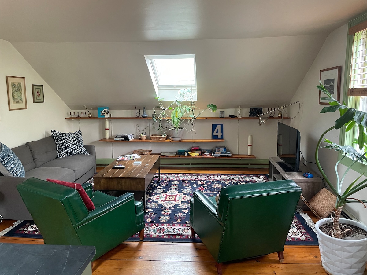 Stanovanje v nadstropju, polno svetlobe (4 strešna okna!) v 169 let starem domu. Udobna in igriva dekoracija z veliko nostalgije. Hiša ima čudovita široka tla iz borove deske. Če vam je všeč ravne črte, ta hiša ni za vas - je malo nerodna, vendar se nam zdi, da je njen čar daleč od tega, da so ukrivljena vrata in druge posebnosti. Nahaja se v Fox Pointu, 15 min hoje do rjave barve, le nekaj korakov od ulic Wickenden in Ives, Newport Ferry, kavarne in restavracije, vendar na stranski ulici izven vsega.
