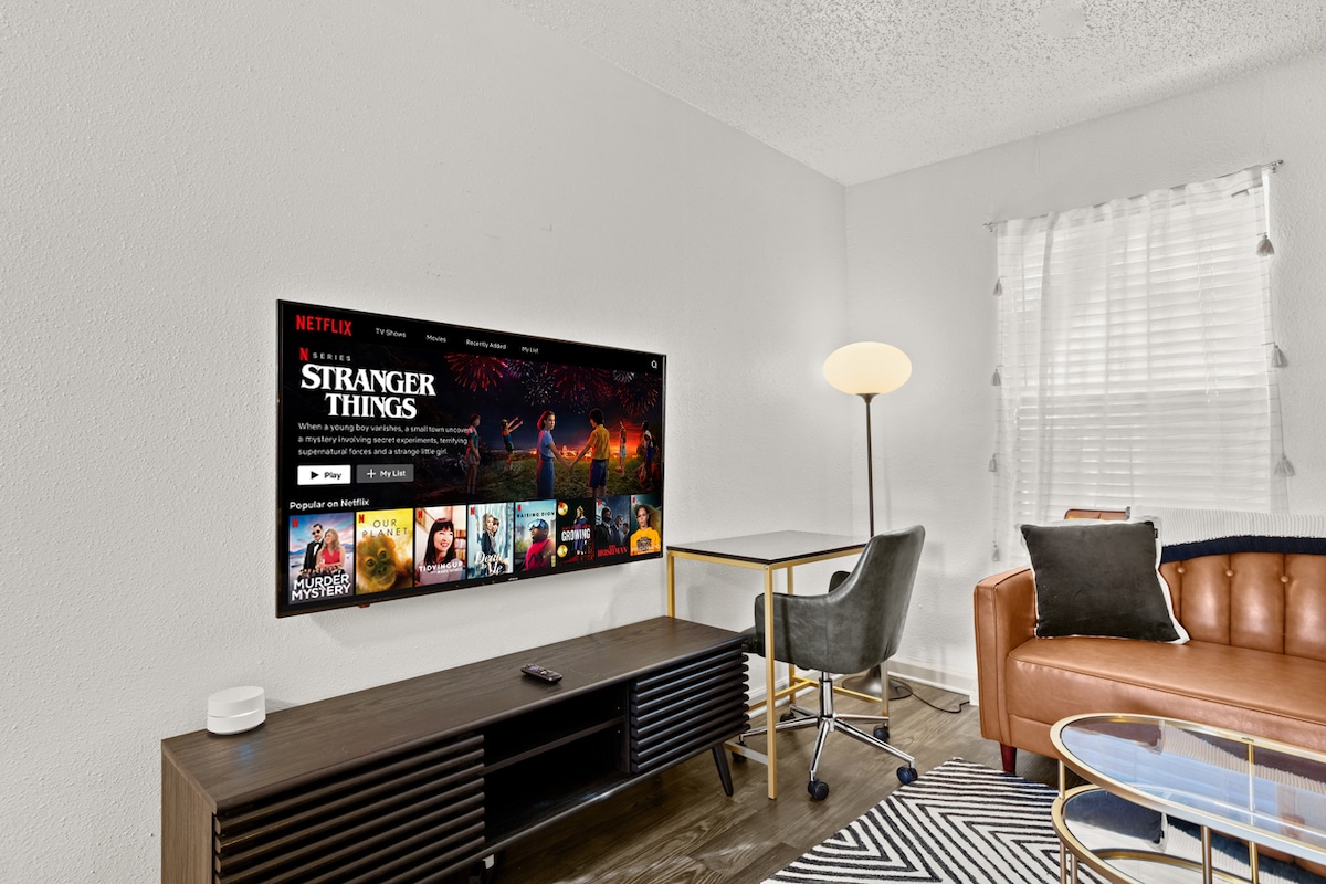 Unwind in style at this centrally-located studio with a beautiful balcony looking out at tennis courts and the city! Bring your own records for the turntable or blast to the past with some in-house classics. Located steps from Barton Springs and Zilker Park with amazing bike trails and quick access to downtown. Fully stocked kitchen, long mirrors, sleeper sofa w/360 smart TV, and highspeed fiber internet with a desk/workspace.