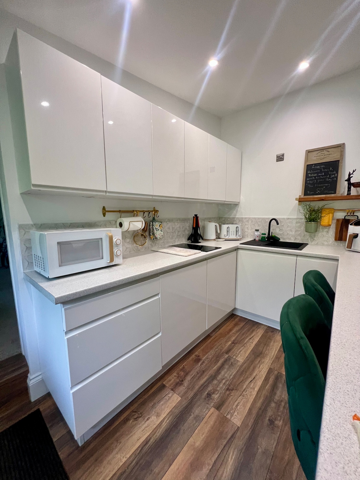 Na novo opremljeno in opremljeno za leto 2021 vstopite v zasebno suito v pritličju in vstopite naravnost v novo, čudovito opremljeno kuhinjo z gospodinjskimi aparati, elegantno jedilnico, ki je idealna za sproščene in udobne romantične večerje s svečami. V pritličju vstopite v topel dnevni prostor z majhnim balkonom z razgledom na park Baysgarth, opremljen s kavčem in ujemajočimi se stoli, mehko osvetlitvijo in pametno televizijo, ki vodi v spalnico z razkošno starinsko francosko posteljo in kopalnico v spalnici.