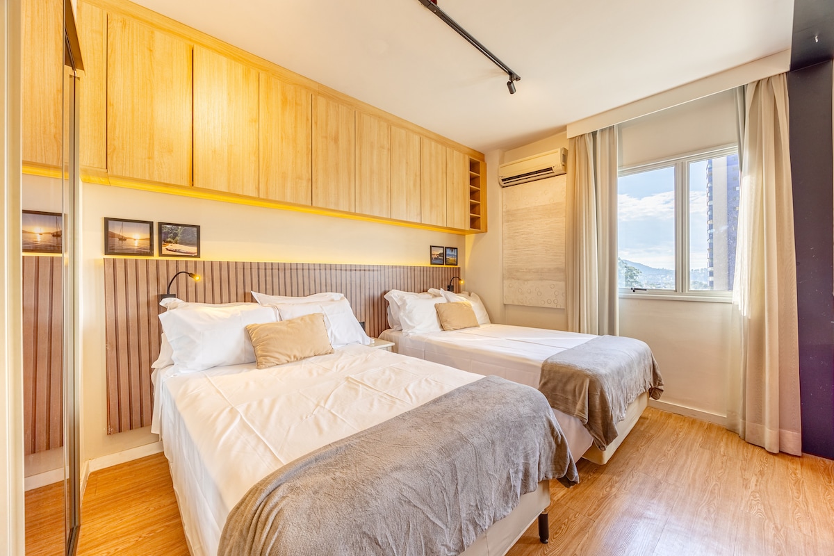 Okrašeno in zasnovano tako, da se boste počutili kot doma. Pogled na zeleno in odlično lokacijo (pred tržnico Sugar Loaf, trgovino za male živali, v bližini Alamede Rio Negro, nakupovalnega središča Iguatemi, restavracij in drugih storitev). S aparati Nespresso in B.Blend. Celotno stanovanje v klubu z igralnico, telovadnico, bazenom, kinodvorano in drugimi storitvami. 1 spalnica z zakonsko posteljo in kopalnico (apartma) 1 spalnica z enojno posteljo (Prenosna zibelka Maxi Cosi, na zahtevo) 2 kopalnici 2 mesti