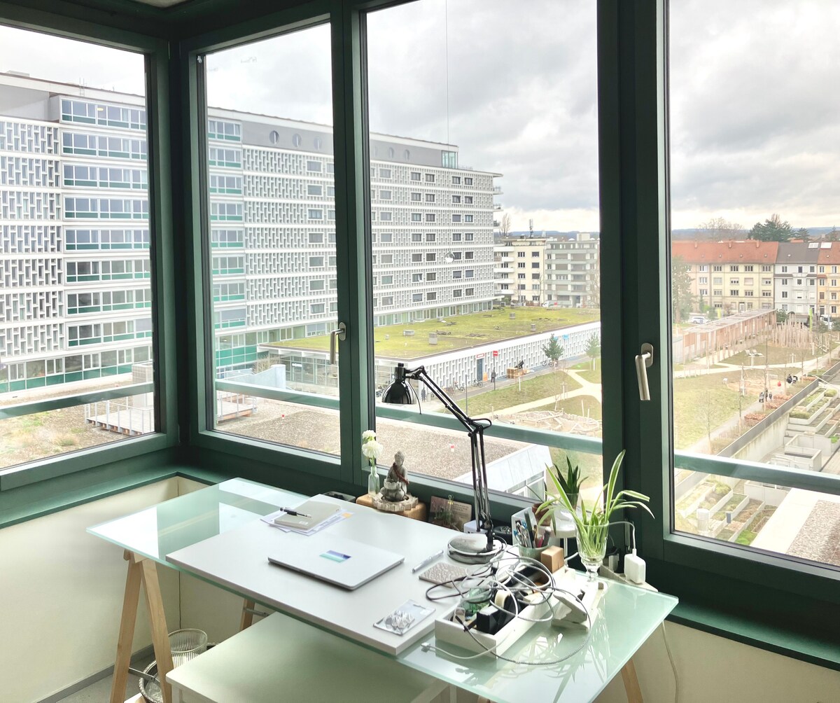 Nutze das Studio für deine Zecke, entspanne dich nach getaner Arbeit im von Bäumen eingesäumten ruhigen Hinterhof, oder geniesse deine Ferientage in der Peripherie von Basel. Mit dem Tram bist du in 12 Min im Stadtzentrum, Badeplätze an der Birs oder am Rhein befinden sich in einer Gehdistanz von 5-10 Minuten.