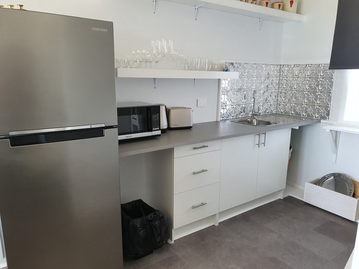 Apartma S/C z lastnim vhodom, idealen za krajša bivanja. Vključuje dnevno sobo, ločen prostor v spalnici (1 x postelja QS), kopalnico. Kuhinjska niša z mikrovalovno pečico, mini hladilnikom, aparatom Nespresso, majhno električno ponvijo, grelnikom za vodo in opekačem za kruh. BREZ kuhalne plošče/pečice Klimatska naprava in Wi-Fi Žar Weber na zasebni terasi Netflix, TV in DVD-ji, majhen TV v spalnici 6 minut hoje do središča mesta, 2 minuti dlje do plaže Za prva 2 dni sta na voljo živila za lahek kontinentalni zajtrk Posteljnina je na voljo Brez stroška čiščenja Brezplačno parkiranje na ulici Hišni ljubljenčki niso dovoljeni