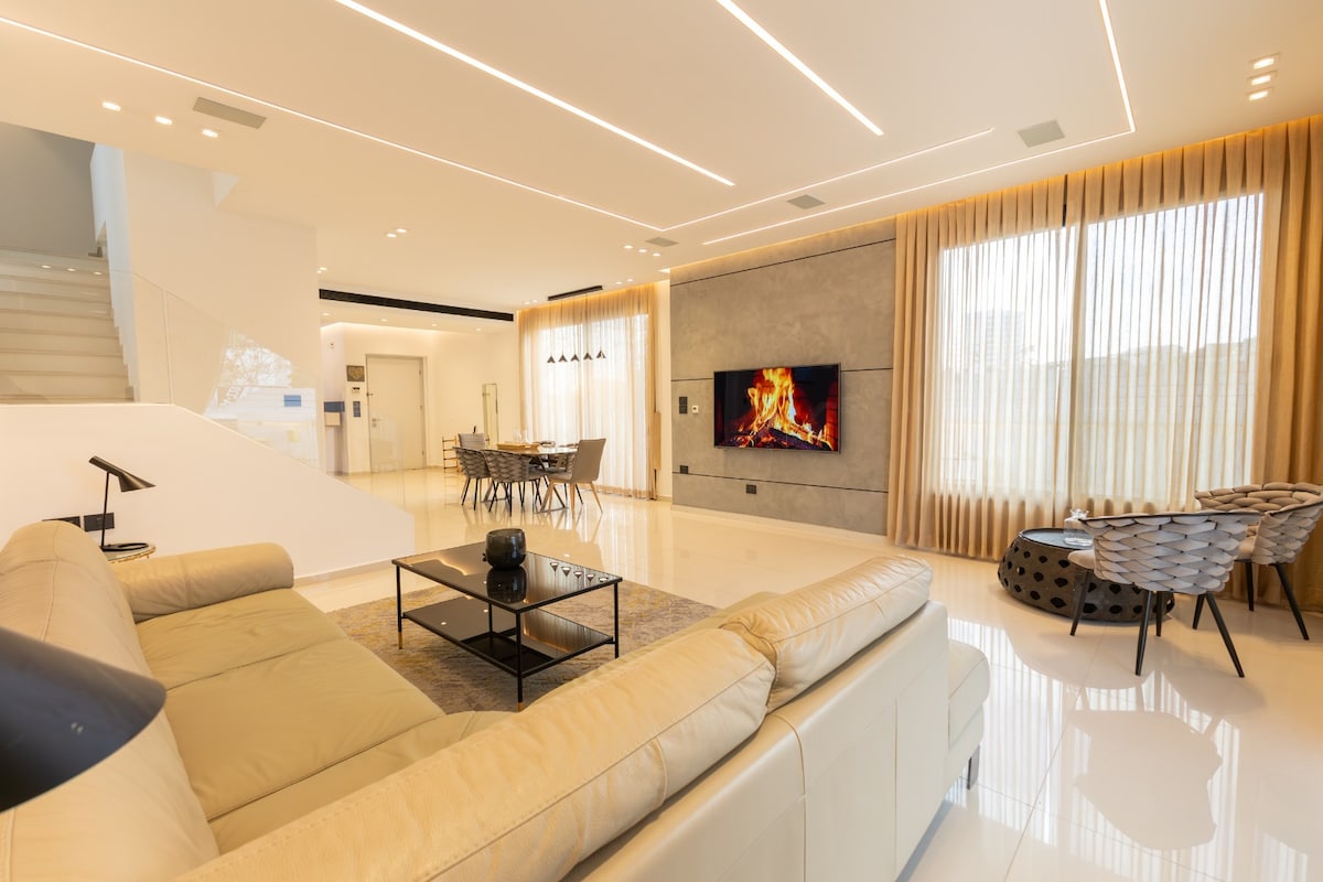 New villa in a gated neighborhood. 4 Bedroom, 4 Bathroom with pool and fireplace. 20 Minutes from Tel Aviv, 4o minutes from Jerusalem and 10 minutes from the most beautiful beach in Israel Palmachim and Weizmann Institute. No children under 12 years old allowed (for safety reasons). לא למסיבות וארועים! מתאים להתארגנות חתן וכלה. בית מפנק עם שולחן פינג-פונג , בריכה, ברביקיו, שש-בש ועוד. מטבח מאובזר בכלים, טוסטר,מיקרוגל ,מדיח כלים מכונת כביסה וייבוש. חדרים גדולים ומפנקים הכל נקי וחדש ברמה גבוה