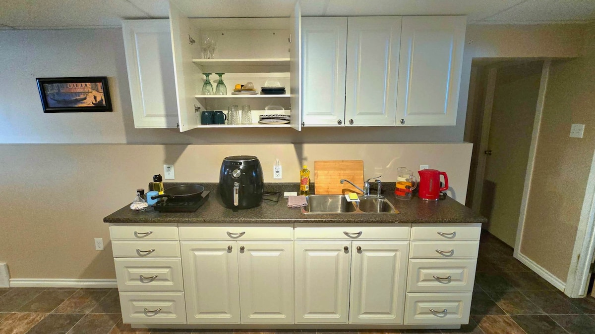Relax with the whole family at this peaceful place to stay.Cozy Basement Suite. Fully Equipped & Private Retreat! Perfect for couples, solo travelers, or small families. Enjoy a private entrance, full kitchen with air fryer & essentials, comfy queen bed, modern bathroom, and cozy living/dining area. Fast WiFi, laundry in-unit, and ampleparking included. Quiet neighborhood, close to park. Sleeps 2 comfortably. 5-star vibes guaranteed!