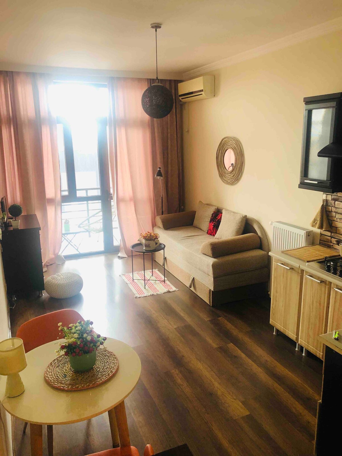 Enjoy a stylish stay in the city center, overlooking the mountains and the sea. A new modern renovation in the loft style, where everything is thought out. Convenient location 5 minutes from the sea, between old and new Batumi.