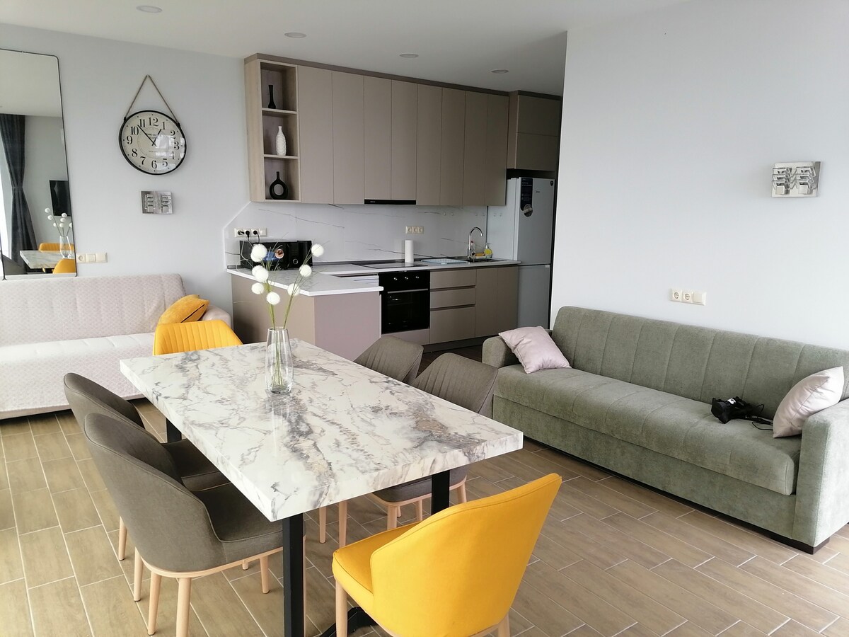 No queue in elevators and reception - NEW Block D2 studio featuring an even more convenient, practical, and stylish design, is available for rent for the first time. Looking for a studio where no one has lived before? The unique location of the apartment offers breathtaking views of the sea, stretching from the new part of the city to the port in the old town, and a stunning panorama of the Caucasus Mountains on the other side. Amenities: big fridge, washer, microwave oven, oven, coffee maker