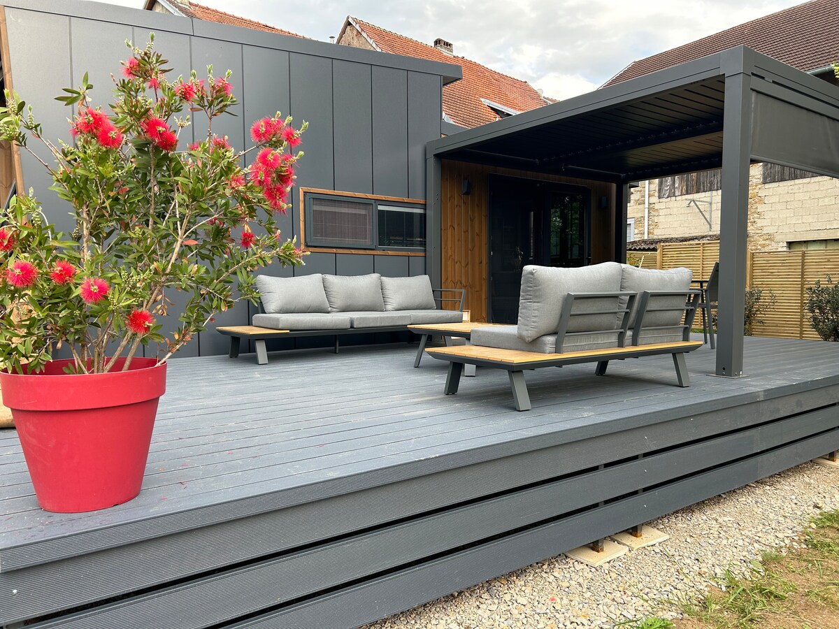 Sprostite se v tem mirnem, elegantnem prenočišču v osrčju hribov, ki gledajo na Chateau-Chalon v vasi Voiteur. V celoti zgrajena z našimi lastnimi rokami, Le Chaleureux je lesena hiša, ki je bila zasnovana v več mesecih, da vam ponudi prenočišče, ki je tako kot mi, v katerem se boste počutili kot doma in v celoti uživali v naši čudoviti regiji. 🏠 Naša druga prenočišča : >Le Cocon . Gîtes Chez Morgane & Thomas > Domaine GUIET