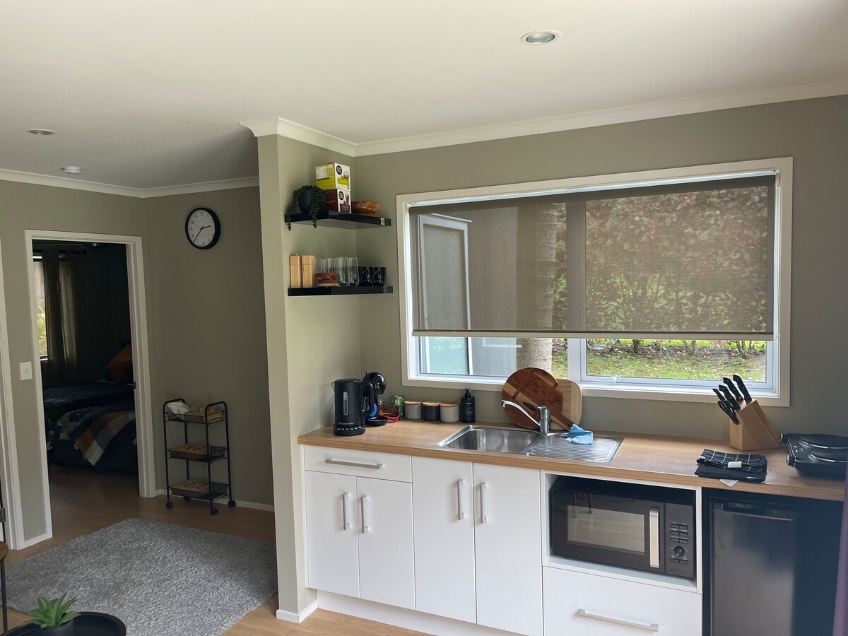 A peaceful, well appointed, dog friendly bach offering fantastic rural views – perfect couples getaway for a relaxing break • 1 bedroom, private self contained apartment with a large deck and fully fenced garden. • Stunning view over the valley. • Comfortably appointed, providing everything you need for your holiday. • A house-trained, friendly, well behaved dog is welcome to the bach (just let us know your are bringing your pooch when you book)