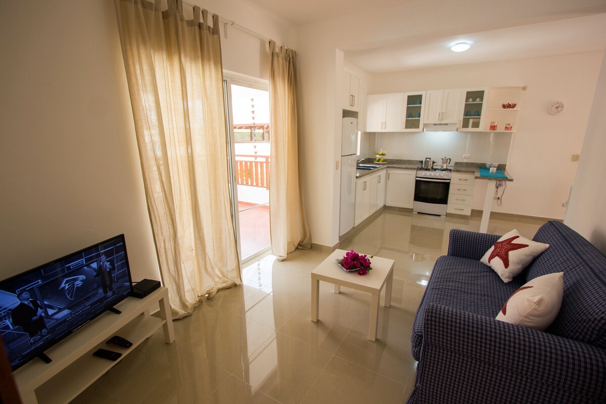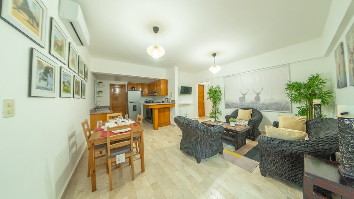 Departamento #4 – Residencial Los García Udobna in sodobna, z 2 spalnicama, 2 kopalnicama, klimatizirano sobo in televizijo, opremljeno kuhinjo in zasebnim balkonom. Strešna terasa z barom, žarom in prostorom za sprostitev. Hiter Wi-Fi, pokrito parkirišče z nadzorom in pralnico. Le 5 minut od Playa Caleta in Multiplaza, 10 minut od Casa de Campo in 20 minut od Bayahíbe. Družinam prijazno in kratkotrajno ali daljše bivanje Ob rezervaciji mi sporočite, če potrebujete parkirno mesto, saj imam na voljo le 4 parkirna mesta