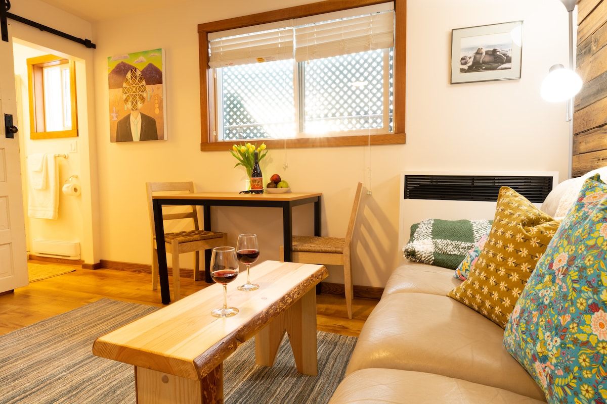 A relaxing retreat for couples, solos or business travelers. Above ground, private entry-self check in. Free parking. King bed, in suite laundry, Fast WIFI. Fully stocked kitchen- coffee, light grab and go breakfast included. Melt in the barrel sauna, then relax on a secluded, year-round sheltered patio with a fire table, cozy seating and barbeque all in a quiet, fenced back yard. 5 minutes from Highway 1, 10 minutes to downtown, 55 minutes to Sun Peaks. The perfect base for your next getaway.