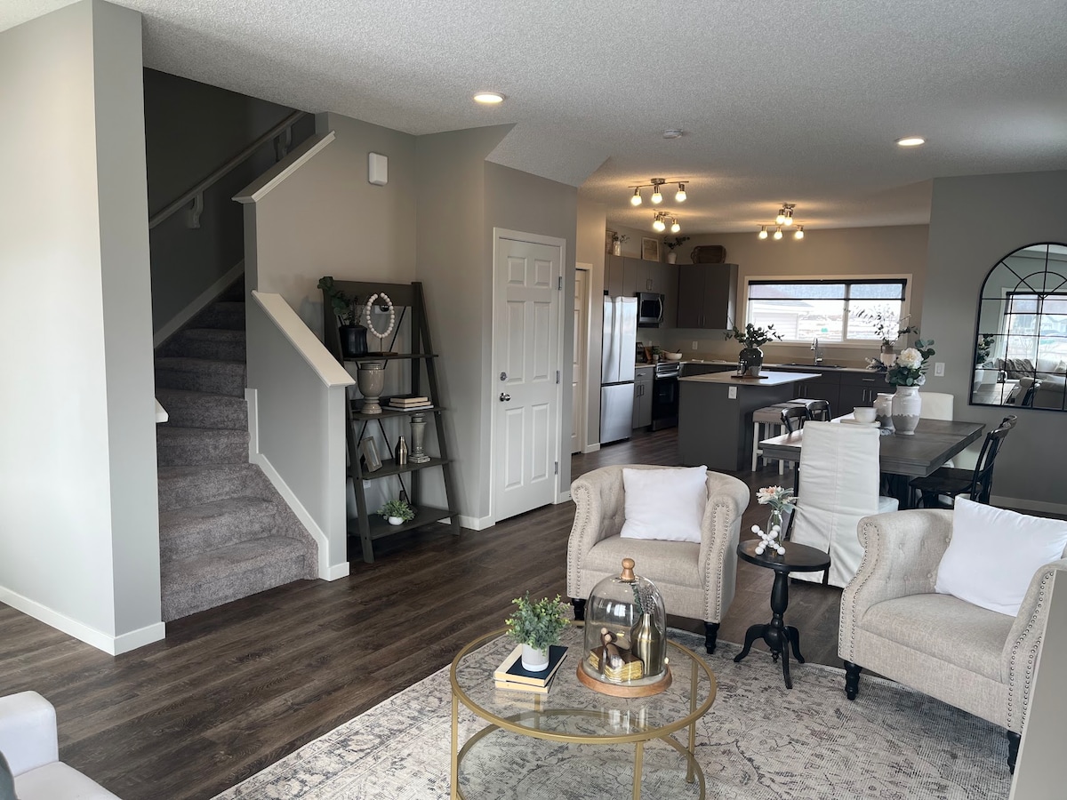 Unwind in this spacious 3-bedroom house in Beaumont, a beautiful and historic French town. Home to top restaurants, parks, museums and attractions. This prime location is only 10 minutes from Edmonton and 15 minutes from Edmonton Airport. ✔ Sleeps up to 10 with 5 Beds & 2.5 Baths ✔ Fully Equipped Kitchen w/ Gas Stove ✔ Keurig Coffee Machine ✔ Comfortable Master Bedroom w/ King Bed ✔ 2 TVs w/ Netflix & Prime Video ✔ Office Desk ✔ High Speed Wi-Fi ✔ In suite laundry ✔ 2 Car Private Garage